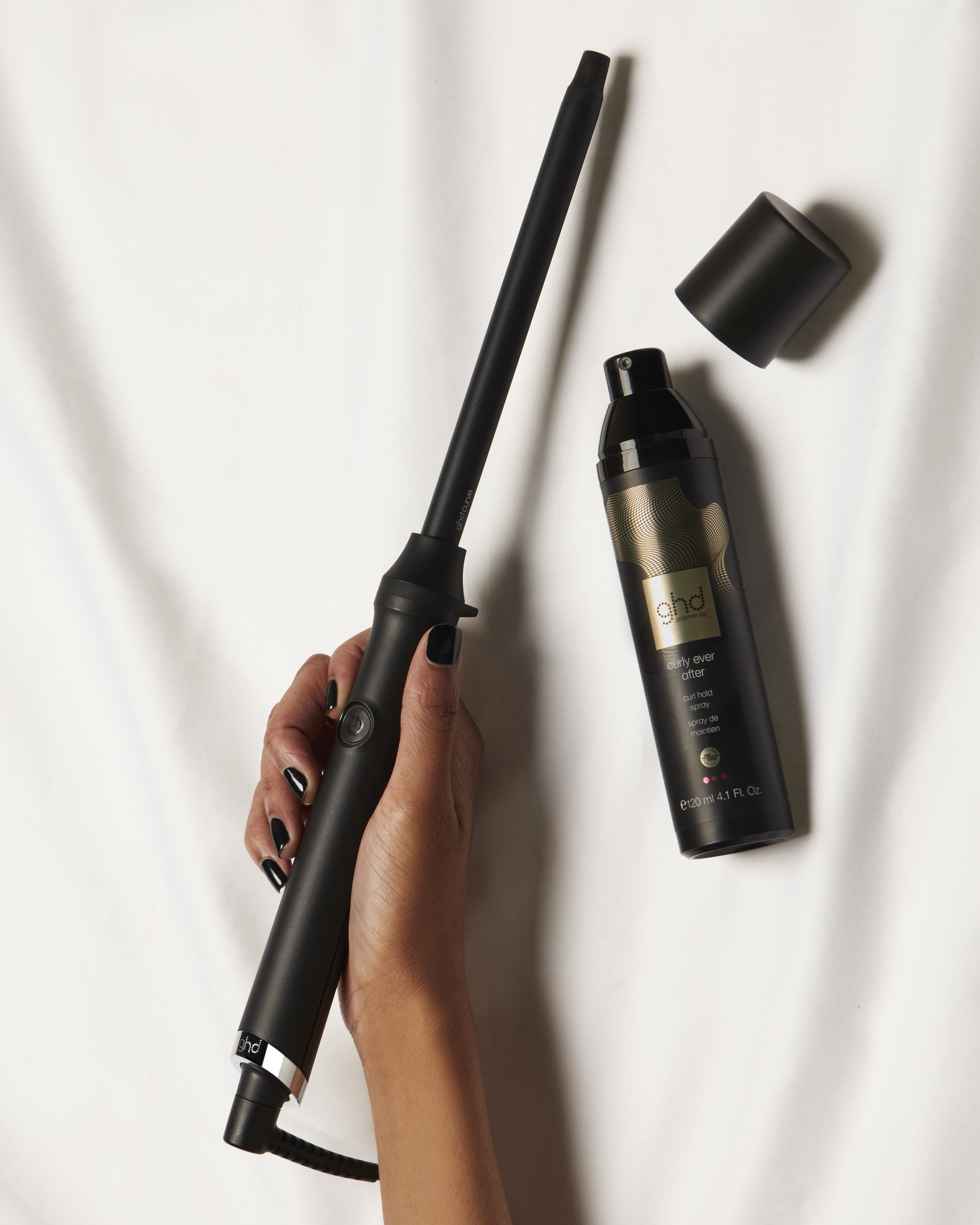 Pour une coiffure sublimée et une tenue jusqu’à 48h***, utilisez votre boucleur avec le spray de maintien ghd – curly ever after.