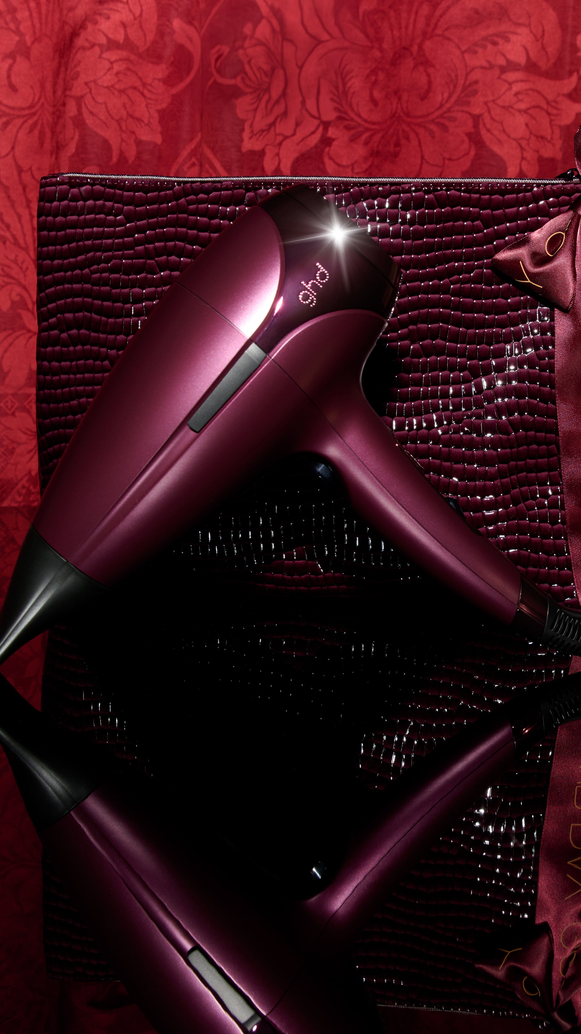 Le sèche-cheveux professionnel ghd Helios Cherry Chic, dans une teinte bordeaux profonde, élégante et raffinée 🍒