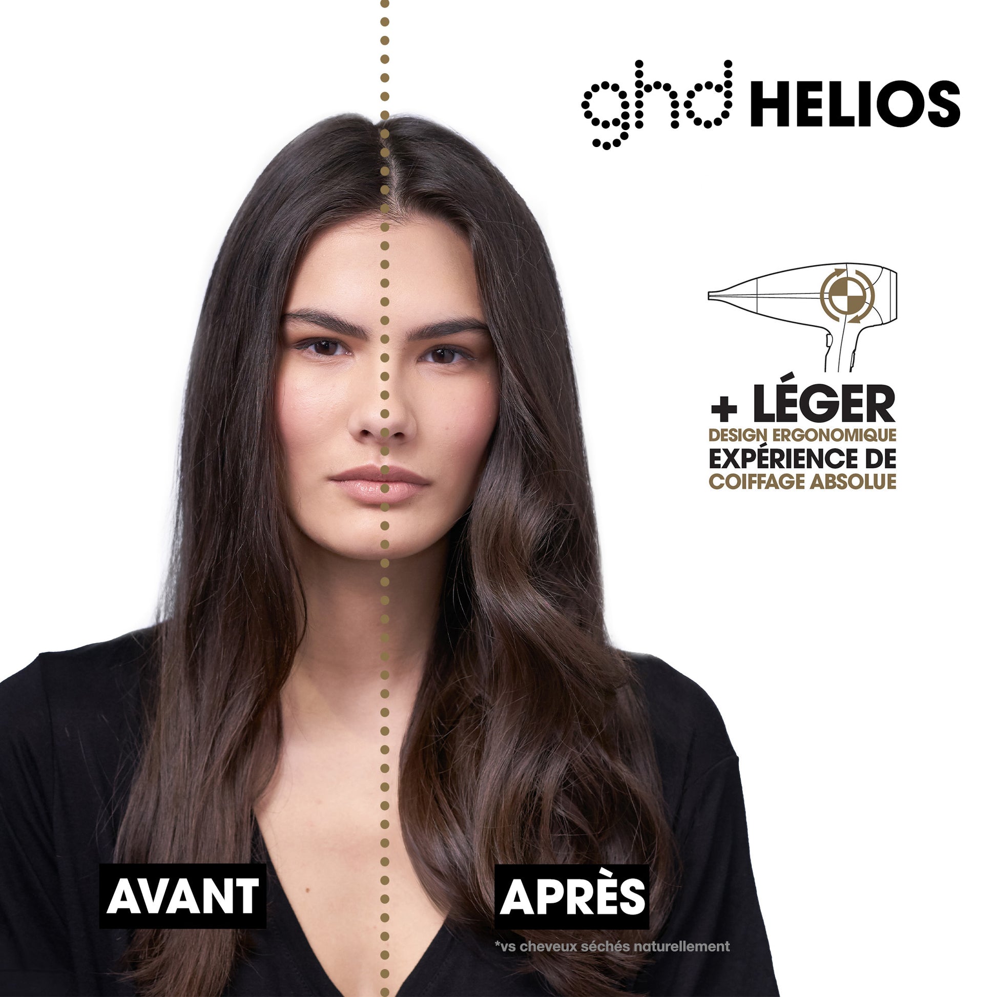 Doté d'un moteur Brushless de 2200 Watts - puissant et longue durée - et d'un embout concentrateur d'air sur-mesure, il délivre un flux d'air puissant et précis de 120 km/h, pour accélérer drastiquement le coiffage* selon 8 personnes sur 10. Pour des cheveux toujours plus brillants, ce sèche-cheveux est doté de la technologie ionique, exclusive ghd, pour 30% de brillance en plus**. Développé par les équipes d'ingénieurs, scientifiques et coiffeurs ghd, helios a été conçu pour une prise en main ergonomique, avec un poids réparti uniformément pour plus de confort lors de l'utilisation.
