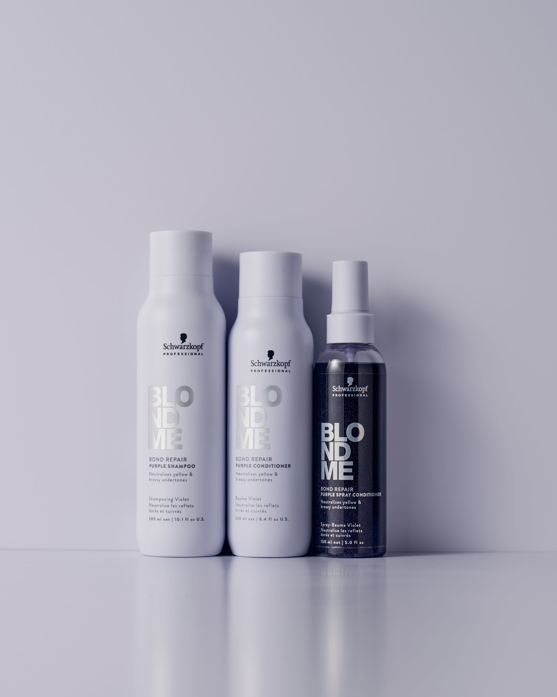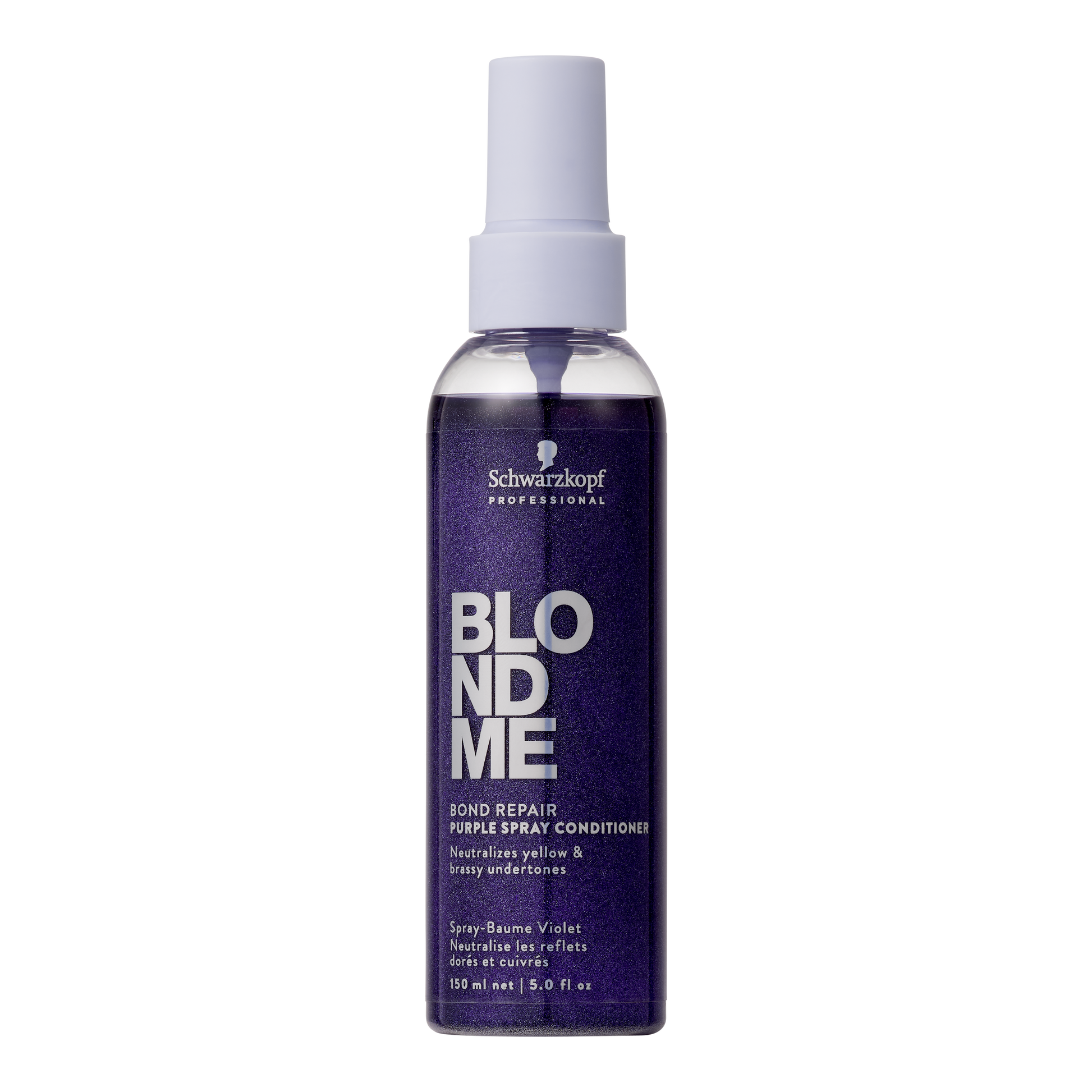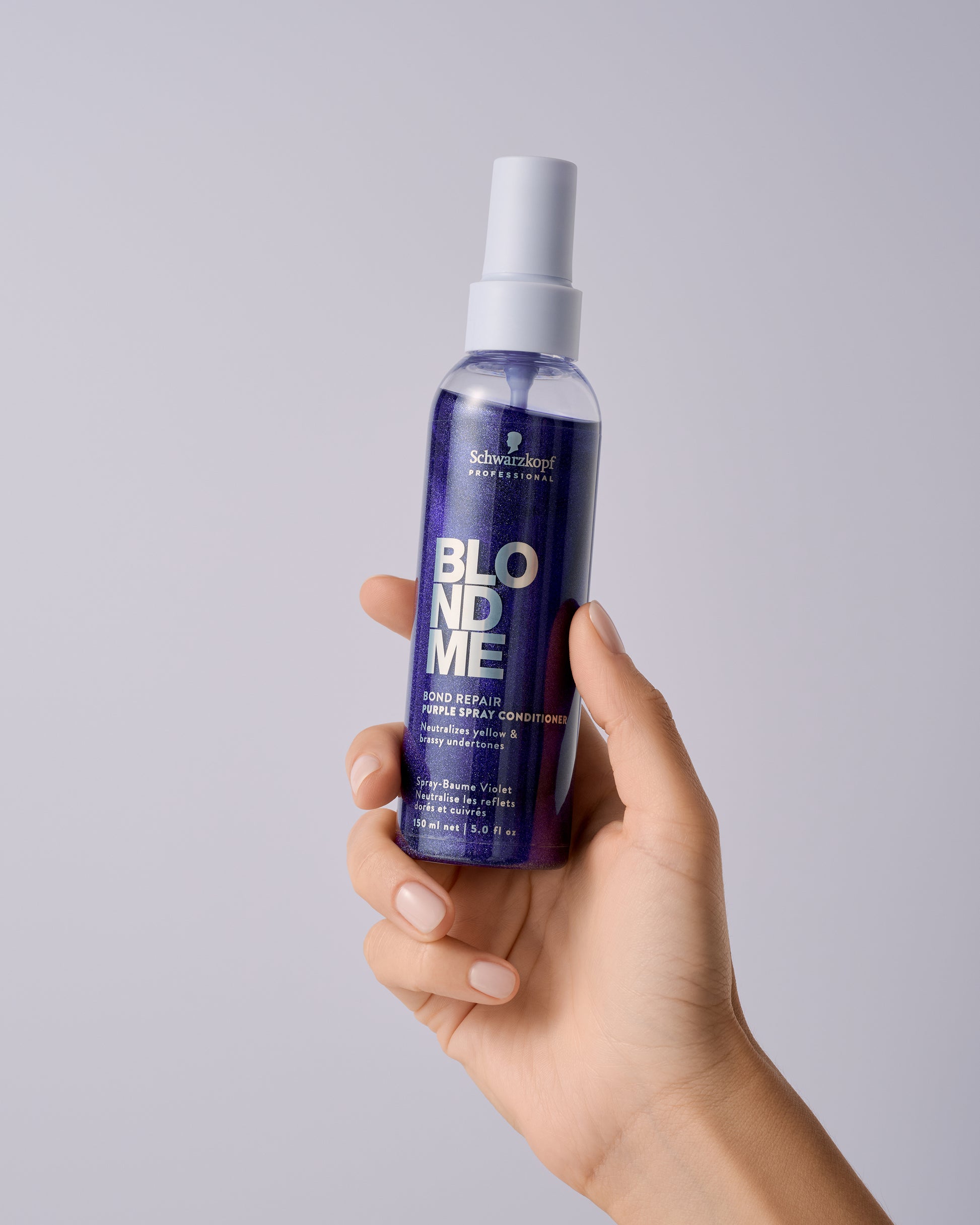 Le Spray-Baume violet BLONDME Bond Repair neutralise les reflets dorés et aide à prévenir les reflets cuivrés.